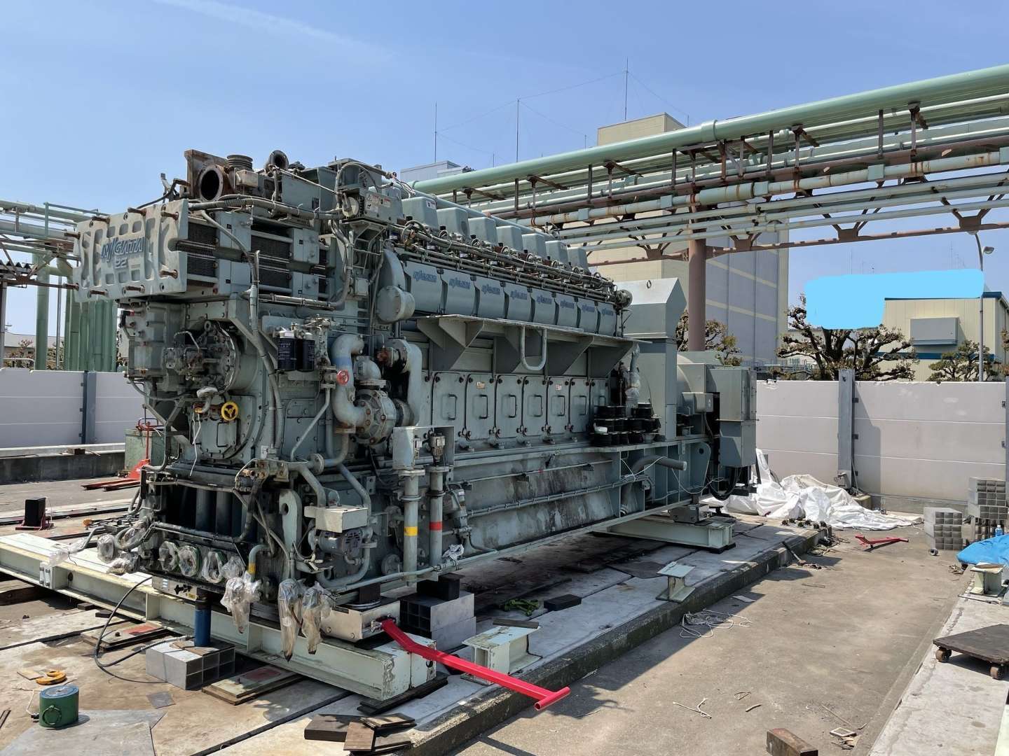①ベースの搬入・据付: 最初に、発電機の基礎となるベースを搬入し、設置場所に据付を行います。ベースは水平かつ安定している必要があり、精密な調整を行います。
